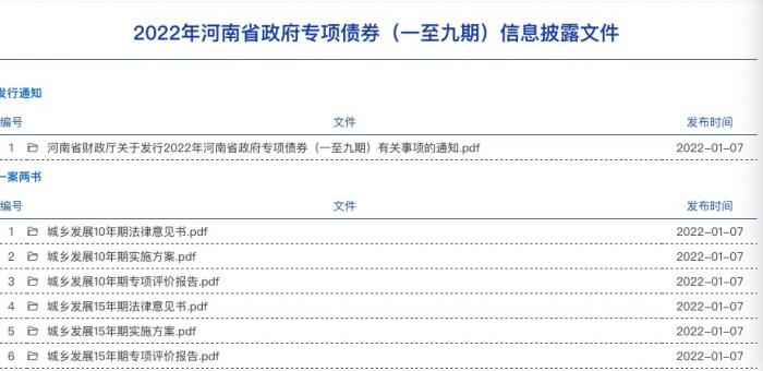 21世纪经济报道记者杨志锦 上海报道 1月7日,河南省在中国债券信息网发布“2022年河南省政府专项债券(一至九期)信息披露文件”。这意味着,今年地方债发行大幕开启,河南将成为2022年首个发行地方债的省份。