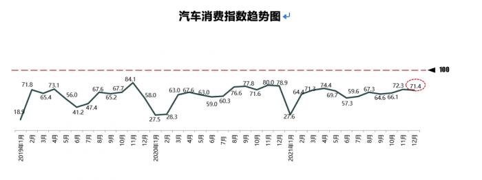 从需求端来看,2021年12月份汽车消费指数为71.4,与11月相比略有下降;从构成汽车消费指数的分指数来看,2021年12月份需求分指数为78.6,较上月略有下降。