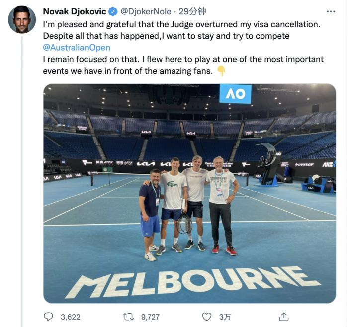 推翻澳大利亚联邦政府吊销签证的决定后,网球名将德约科维奇暂时恢复自由之身,得以顺利从隔离酒店离开。但这并不意味着他可以顺利参加即将举行的2022年澳大利亚网球公开赛。