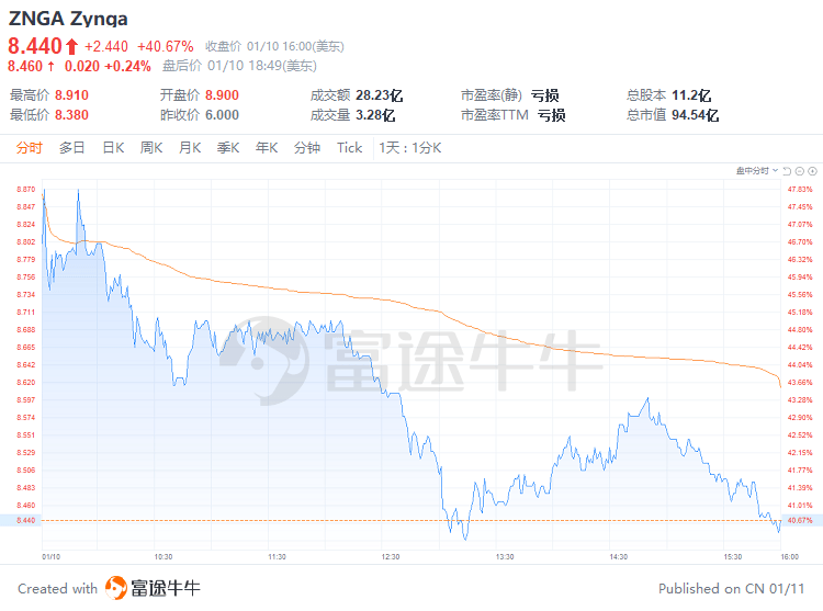 周一美国游戏开发商Take-Two互动软件(TTWO.US)宣布以「现金+股票」的形式收购社交游戏开发商Zynga(ZNGA.US),整体交易的估值达到127亿美元。Take-Two称,将以每股9.86美元收购Zynga的所有流通股,较Zynga上周五的收盘价溢价 64%。这笔交易预计将在2023财年第一季度完成,但需获得股东和监管机构的批准。收购完成后,一家新的全球性游戏巨头也将诞生。受此消息影响,作为被收购方的Zynga美股收盘暴涨逾40%,而Take-Two由于需要动用大量的流动现金收购Zynga,收盘大跌13%。