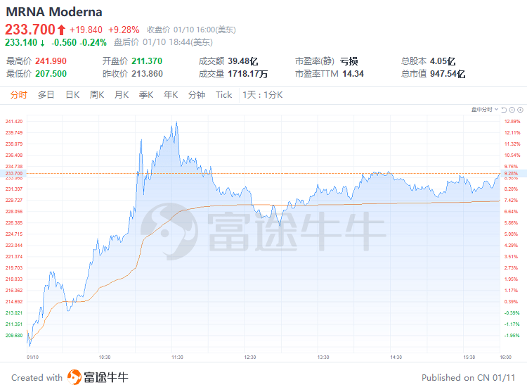 Moderna(MRNA.US) 公司首席执行官Stephane Bancel周一表示,该公司正在为今年秋天开发一种针对奥密克戎的加强针,它将很快进入临床试验。Moderna公司已经签署了预付款价值185亿美元的预购协议,英国、韩国和瑞士最近订购了今年秋季的针剂。Bancel说,该公司今年可以提供20亿到30亿加强剂。截至收盘,Moderna涨超9%。