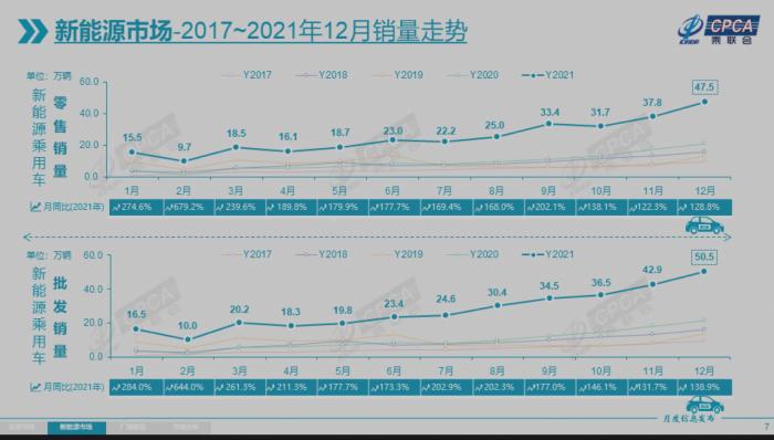 数据显示,去年12月新能源乘用车零售销量达到47.5万辆,同比增长128.8%,环比增长25.4%。2021年全年,新能源车零售298.9万辆,同比增长169.1%。