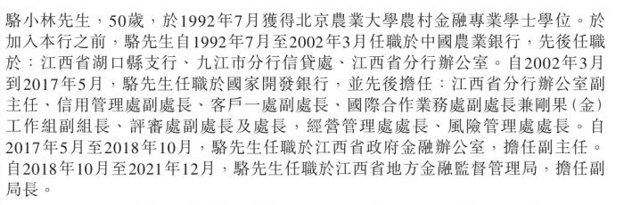 根据公告,现年50岁的骆小林曾长期在银行业工作,2017年5月起进入江西省政府部门工作,此次获聘江西银行行长前担任江西省地方金融监督管理局副局长。以下为其详细简历: