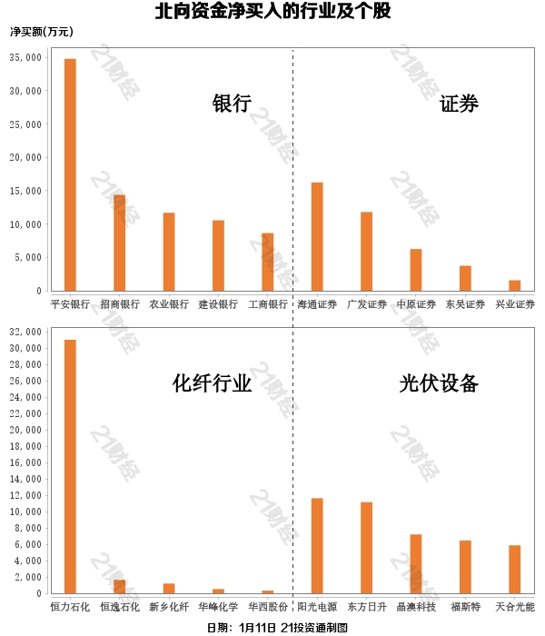 从净买入金额来看,北向资金增持了33个行业,其中银行居首,净买入金额达12.21亿元,其次是证券行业,净买入3.22亿元。