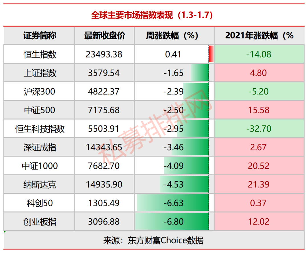 从主要市场指数来看,市场对美联储可能加速收紧货币政策的讨论越发热烈,美股波动率加大。A股方面,2022年首周市场没有出现大家期望的开门红,“开门绿”行情也是投资者的心头蒙上了一层阴影。其中,恒生指数0.41%,上证指数-1.65%、沪深300指数-2.39%、中证500指数-2.50%、纳斯达克指数-4.53%、 创业板指-6.80%。