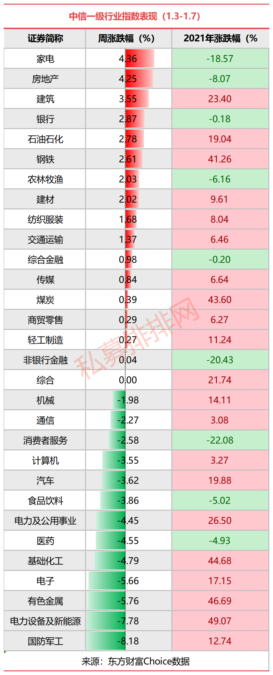 板块方面,国防军工-8.18%、电力设备及新能源-7.78%、 有色金属-5.76%、 电子-5.66%、基础化工-4.79 %、周度跌幅在中信行业居于前五,在2021年,上述行业分别上涨12.74%、49.07%、46.69%、17.15%、44.68%。家电、房地产、建筑、银行、石油石化涨幅居前,周度上涨4.36%、 4.25%、 3.55%、 2.87%、 2.78%。