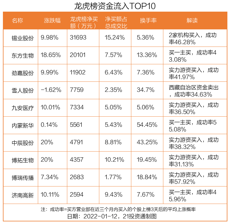 1月12日,上证指数上涨0.84%,深证成指上涨1.39%,创业板指上涨2.64%。盘后龙虎榜数据显示,共有48只个股因当日异动登上龙虎榜,资金净流入最多的是锡业股份(000960.SZ),达3.17亿元。