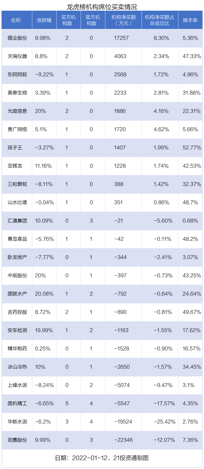 1月12日,23只个股龙虎榜出现了机构的身影,机构合计净卖出2.72亿元。具体来看,机构净买入10股,净卖出13股。