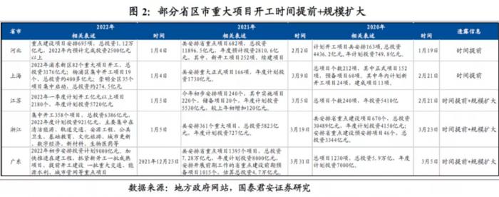 从已经召开两会的省区市来看,重大项目均成为稳增长主要抓手,且开工时点普遍提前,投资规模也有所扩大。