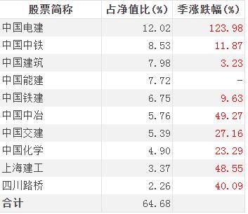 重仓持股看,三季报显示,截至9月末,基建50ETF前十大持仓资金占净值比例为64.68%,前十大持仓股票分别有中国电建、中国中铁、中国建筑、中国能建、中国铁建、中国中冶、中国交建、中国化学、上海建工和四川路桥。除了中国能建三季度末才上市外,重仓的股票三季度都出现不同程度的涨幅。