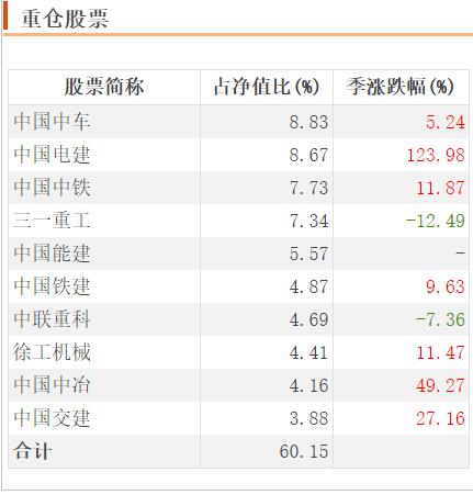中国中车为第一大重仓股,季度涨幅为5.24%,中国电建是该基金的第二大重仓股票。在十大重仓的股票中三一中国、中联中科在三季度表现不佳,均跌超7%。