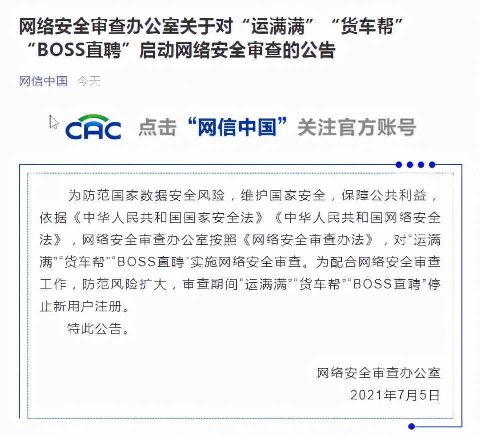 而除了滴滴以外,其实一众赴美上市的互联网公司,都将面临这一难题。与滴滴一起在6月份赴美上市的满帮和BOSS直聘,所经营的业务范畴同样涉及大量的敏感数据,两家公司均在7月被国信办实施网络安全审查,期间停止新用户注册,满帮的股价从上市至今,也是近乎腰斩。