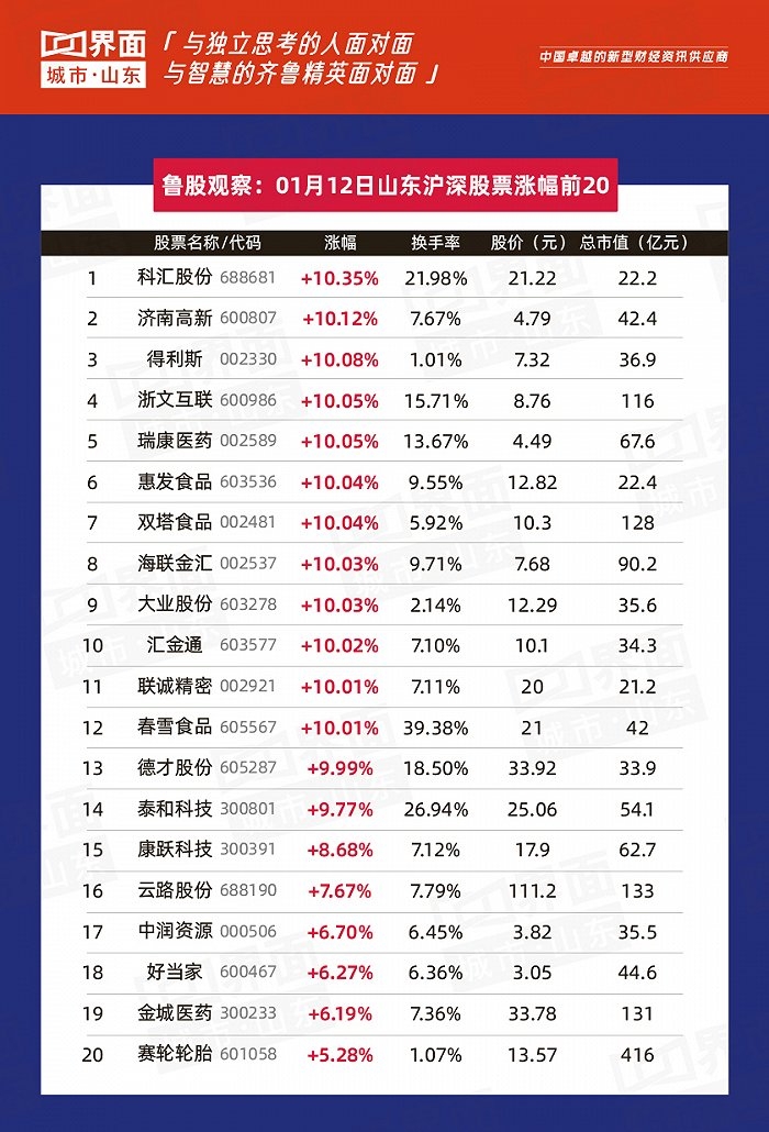 1月12日,受大盘影响,山东198只个股上涨,56只个股下跌,科汇股份领涨。