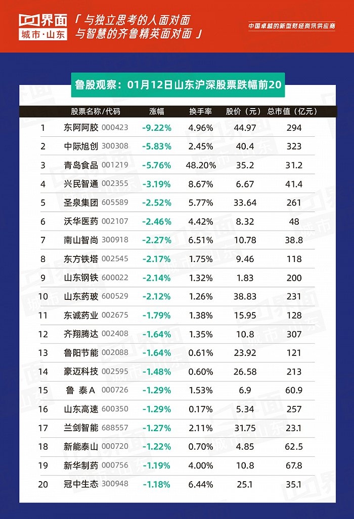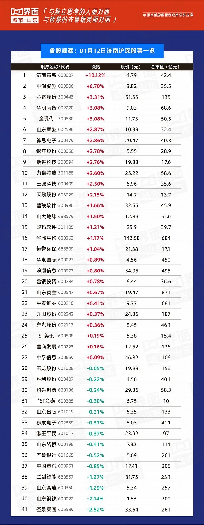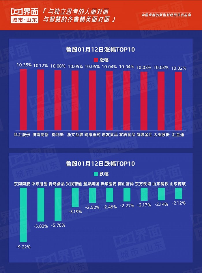 1月12日,山东198股上涨,6股持平,56股下跌。