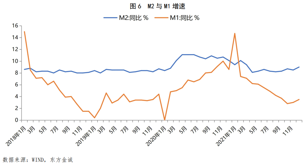 12月末M1同比增速延续反弹,达到3.5%,也主要是受上年基数变化影响。当前M1增速处于明显偏低水平,主要原因是近期商品房销量继续处于同比两位数的下滑过程——历史数据显示,M1增速与房地产市场热度存在较强关联。另外,当前经济下行压力较大,实体经济活跃度下降,这也是拖累M1增速偏低的重要原因。