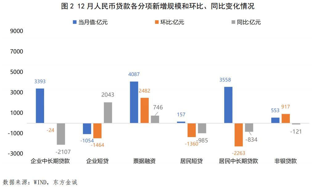 12月信贷表现偏弱,体现于受企业信贷需求难以快速改善、银行风险偏好较低、房地产市场持续下滑,以及年末部分银行可能会为下一年“开门红”预留项目等因素影响,当月信贷增速下行,且存在明显的票据冲量现象,信贷结构短期化特征加剧。