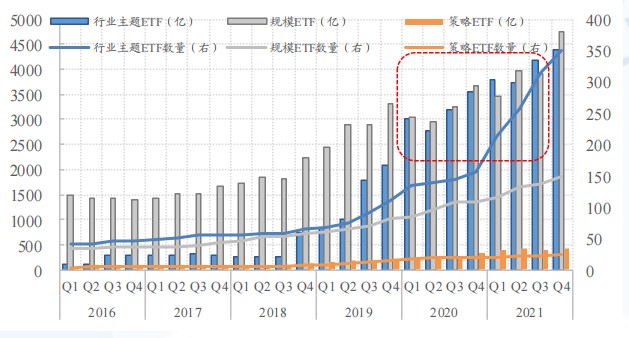 2019年-2021年,股票ETF迎来快速发展的高光时期,规模及产品数量逐季加速增长。由于美股在2021年持续新高的表现,QDII ETF低门槛特点,使其在2021年发展迅速。股票ETF分为:宽基ETF、行业ETF、主题ETF、策略ETF。 2020年以前,宽基ETF一直占据主导地位(规模市占率超60%)。2020年Q1行业和主题ETF(合计)首次超