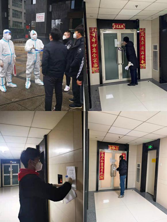 旺座现代城因出现确诊病例,楼内所有人员已被转运至指定隔离点。按照防疫要求,转运结束后需要检查隔离区域封闭情况,对楼内所有住户大门贴封条,赵重阳、尹振东、韦晨佳、盛承龙逐层逐户开展“扫楼”行动,对每一户门上的封条密封情况查验,对不完整或破坏的的逐户补贴封条,张贴求助服务电话等,确保不漏一户。