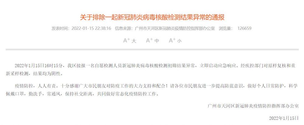 2022年1月15日22时许,广州市天河区发布通报称,1月15日16时15分,天河区接报一名自愿检测人员新冠肺炎病毒核酸检测初筛结果异常,立即启动应急响应。经疾控部门对原样复核和重新采样检测,结果均为阴性。
