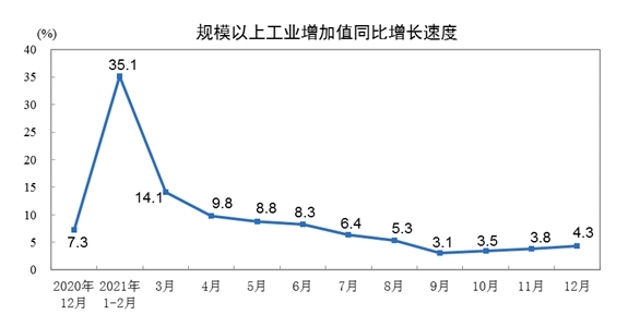 国家统计局:2021年12月份规模以上工业增加值增长4.3%