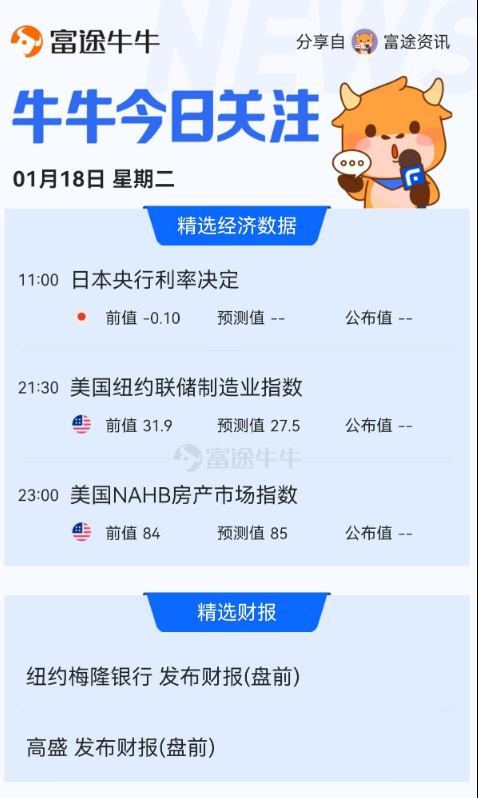 周二,重点财经数据不多。投资者可关注日本央行利率决定、美国纽约联储制造业指数及美国NAHB房产市场指数。