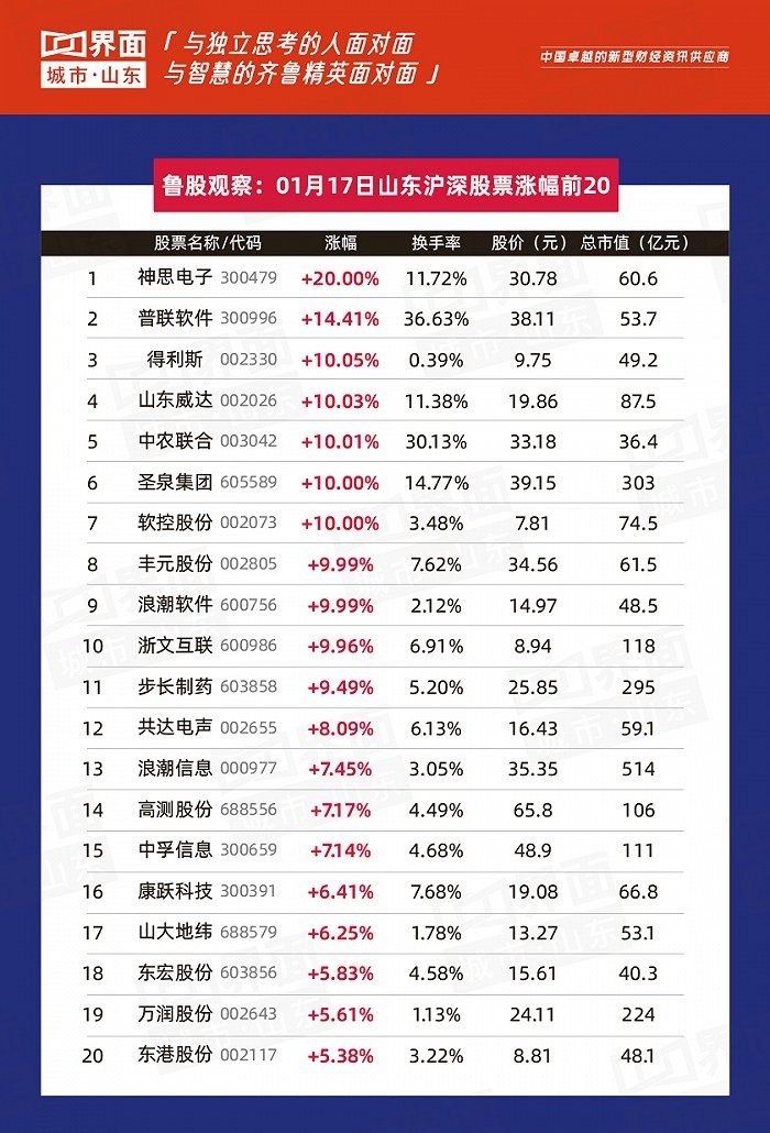 济南市涨幅榜首:神思电子(300479),涨幅20.00%,股价30.78元,总市值60.6亿元;