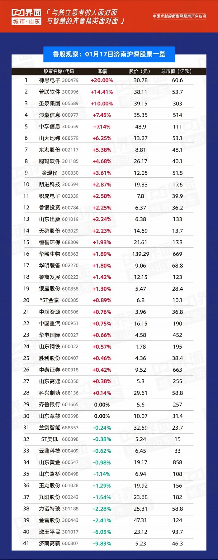 鲁股观察1月17日:-9.83%!国资实控的济南高新领跌全省
