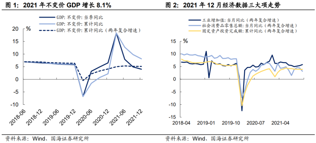 事件 1月17日,国家统计局公布了我国去年12月份经济数据。2021年全国不变价GDP同比增长8.1%,两年复合增长5.1%;去年1-12月份固定资产投资累计同比增加4.9%,两年复合增长3.9%;去年12月份,规模以上工业增加值实际增长4.3%,两年复合增长5.8%;去年12月份社消同比名义增长1.7%,两年复合增长3.14%。