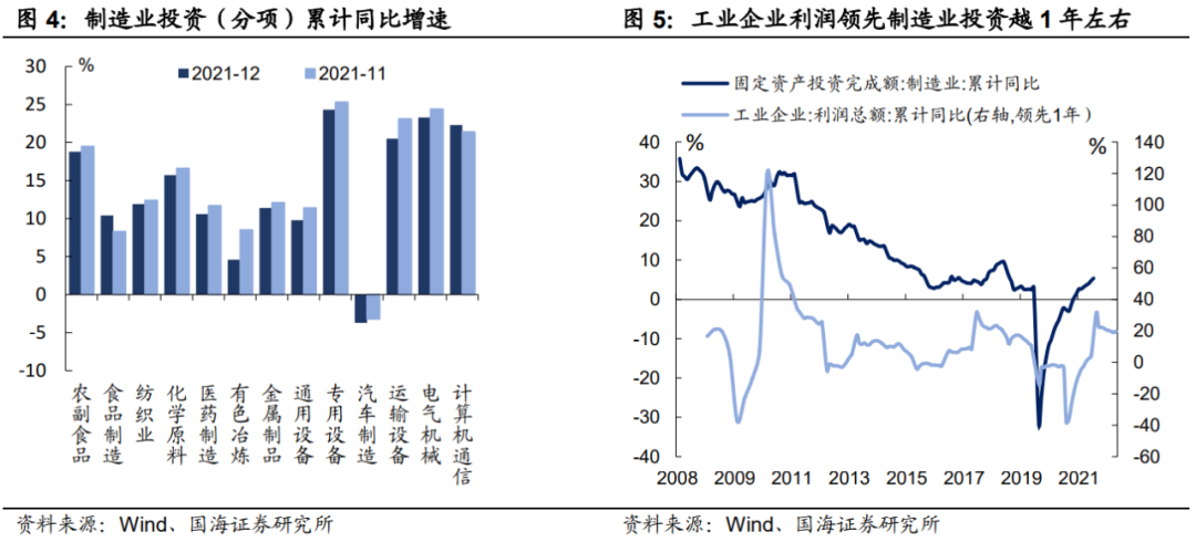 展望未来,我们认为,制造业投资回落趋势不变,节奏上将继续保持温和的回落速率:一方面,Omicron疫情在多国有蔓延趋势,虽然疫苗逐渐普及,但是有效性有待进一步证实,感染率的上升对医疗体系的挤兑不可避免,以东南亚为代表的发展中国家仍有结构性“停工罢工”风险存在,订单回流逻辑短期内仍将边际支撑制造业投资;另一方面,历史上工业企业利润向制造业投资传导时滞约为1年左右,2021年工业企业利润展现出一定韧性,对2022年制造业投资也将产生相应支撑。