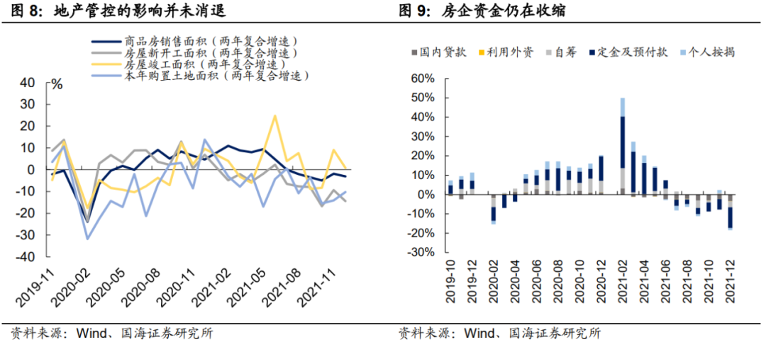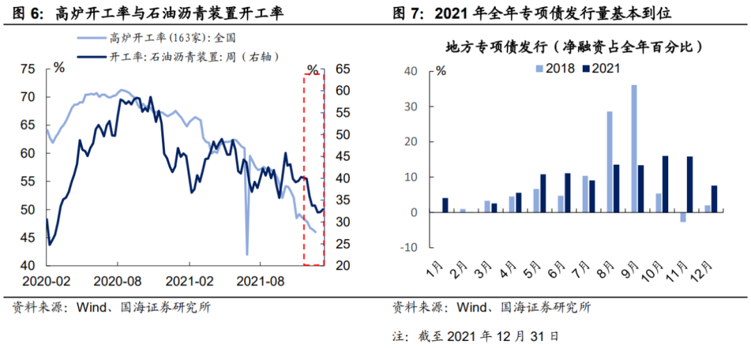 因此,2021年专项债发行已经到位,然而去年12月基建投资增速改善并不显著,一方面,冬季停工和疫情散发对基建开工产生了一定的扰动,高频数据上来看,去年12月高炉开工率和石油沥青开工率数据均出现了不同程度的下滑。另一方面,从财政支出到实际项目落地需要一定的时间传导,而今年尤为如此,我们在《2022年,基建将如何发力?》中指出,当前制约基建项目落地主要由三大因素:(1)中央加强地方债务问题问责,降低政府对基建的诉求;(2)减税降费与民生开支增加挤压基建支出空间;(3)地方党委换届,基建落地节奏滞后。