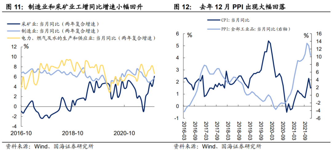 去年12月份规模以上工业增加值当月同比增速继续上升。按三大项来看,采矿业受“保供稳价”政策影响,两年复合增长6.1%,较上月增加2.0个百分点;制造业在“外需不弱”的格局下,两年复合增长5.7%,较上月增加0.5个百分点;电力及燃气供应两年复合增长6.6%,较上月下降1.6个百分点。