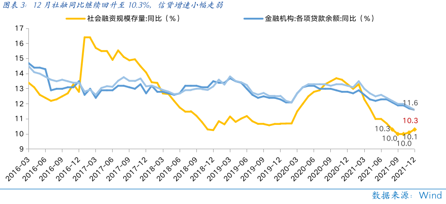 2021年12月社融存量同比增速继续反弹0.2个百分点至10.3%,人民币贷款和对实体的信贷(社融口径)同比增速均小幅走弱至11.6%。历史上,社融增速领先于信贷增速企稳回升,目前“金融底”已经出现,社融增速见底回升,释放信贷改善的信号。此外,12月经济工作会议的部署和央行发力“宽货币”的效果,或尚未完全在当月金融数据中有所显现,叠加2021年专项债后置与2022年基建提前发力的影响,1月信贷投放或迎开门红。向前看2022年金融数据或将逐步好转,“宽信用”可期。