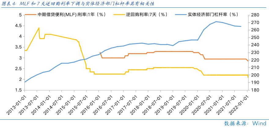 2019年底至2020年初MLF和逆回购利率多次下调,我国宏观杠杆率迅速上升,从2019Q4的246.5%升至2020Q3的271.2%,9个月内上升24.7%。2020Q4开始我国经济进入去杠杆阶段,截至2021Q3已经连续四个季度下降,同比下行6.4%,为1997年以来的最低值。历史上宏观杠杆率加速上行与MLF利率和逆回购利率的下调亦显著相关,去年12月的降准、定向降息和下调1年期LPR为宏观杠杆率的回升留出空间,预计2022年将重回上行区间,为经济释放更多流动性。