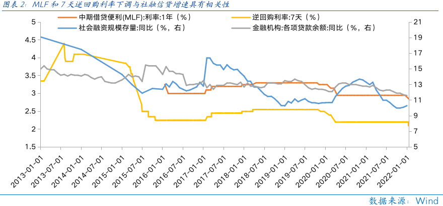 “稳增长”目标下,央行积极发力“宽货币”,去年12月以来央行运用多种货币政策工具组合,全面降准后结构性降息,叠加下调1年期LPR,到本轮调降MLF利率,未来社会融资成本有望显著下降,并带动“信用主体”的贷款需求回升。稳增长周期往往沿着“宽货币-宽信用-稳增长”的路径,历史上MLF利率、7天逆回购利率的下调与社融信贷增速回升、宏观杠杆率加速上行具有较强的相关性,