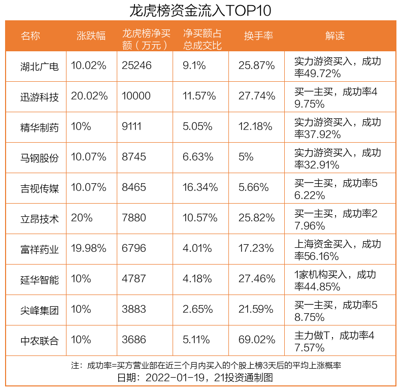 1月19日,上证指数下跌0.33%,深证成指下跌1.28%,创业板指下跌2.17%。盘后龙虎榜数据显示,共有48只个股因当日异动登上龙虎榜,资金净流入最多的是湖北广电(000665.SZ),达2.52亿元。