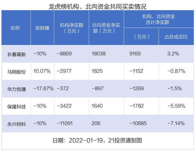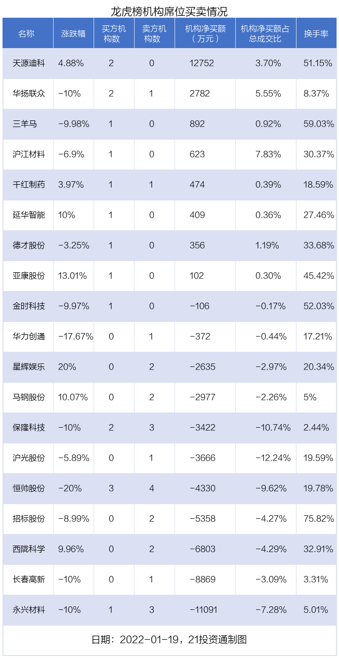 据21投资通(微信号ID:touzit21)智能监测,19只个股龙虎榜出现了机构的身影,北向资金参与龙虎榜中的个股共涉及6只。
