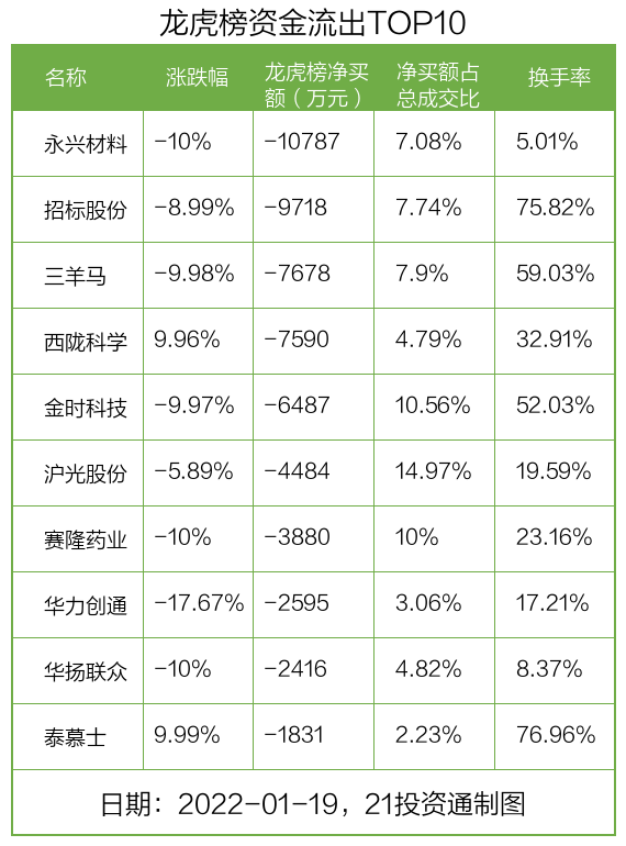而龙虎榜中资金净流出最多的是永兴材料(002756.SZ),被净卖出为1.08亿元,占总成交金额的7.08%。永兴材料收盘下跌10%,换手率为5.01%。