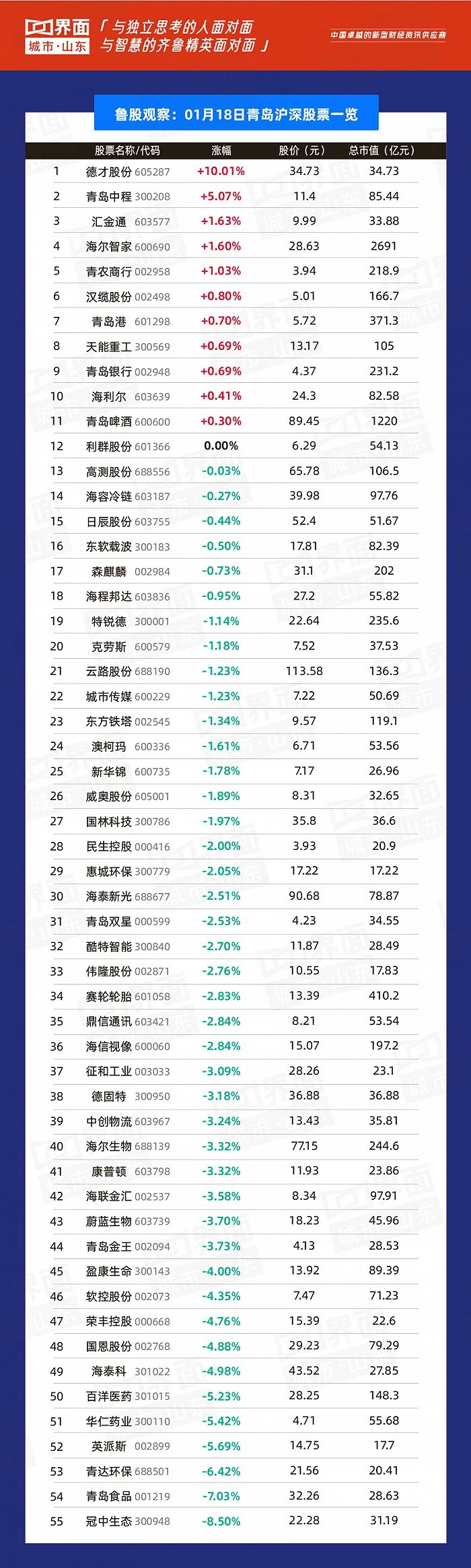 青岛市涨幅榜首:德才股份(605287),涨幅10.01%,股价34.73元,总市值34.7亿元;
