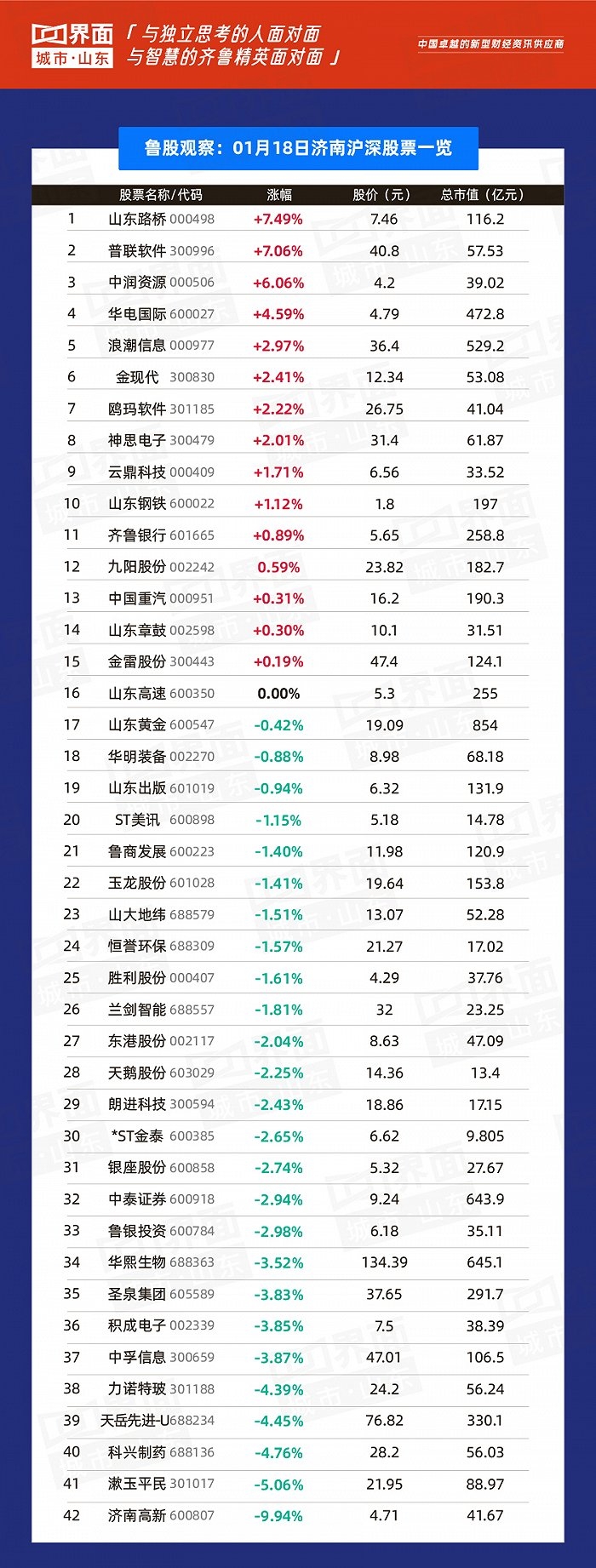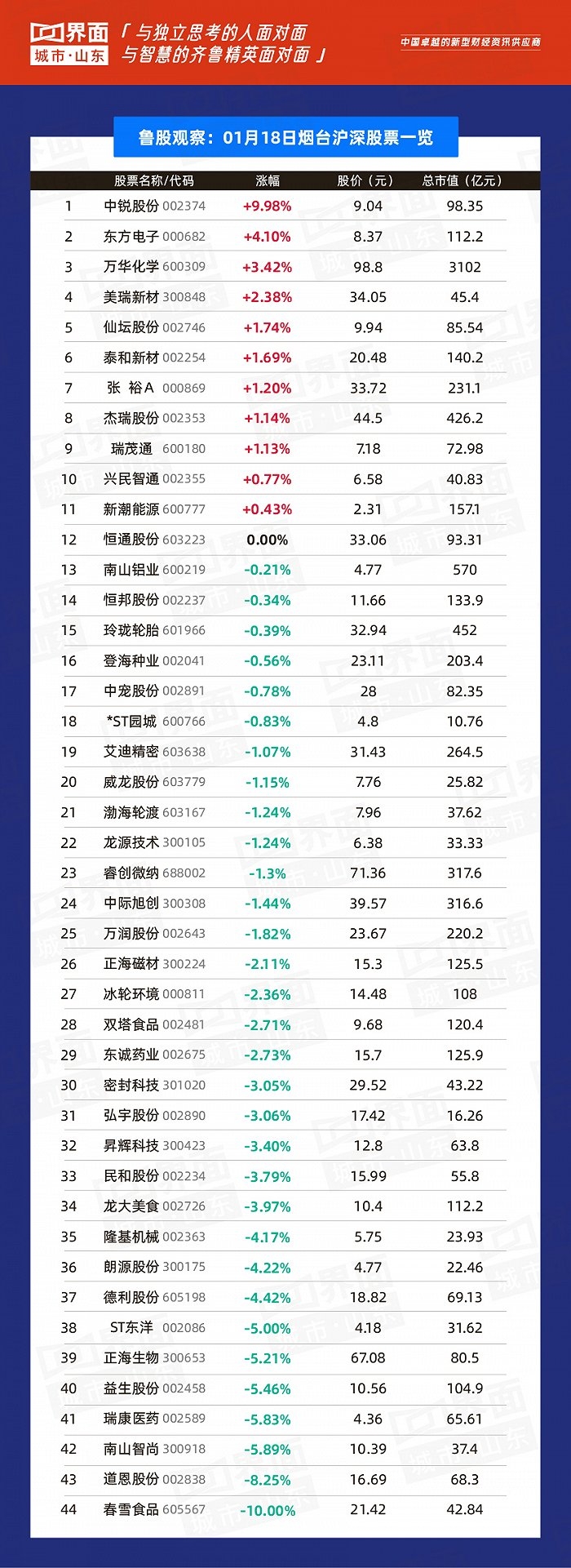 1月18日,山东77股上涨,183股下跌。