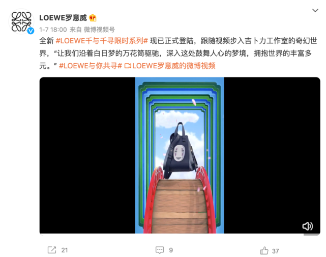 新年1月7日,奢侈品牌LOEWE与宫崎骏动漫《千与千寻》带来开年后值得关注的第一波品牌跨界营销。