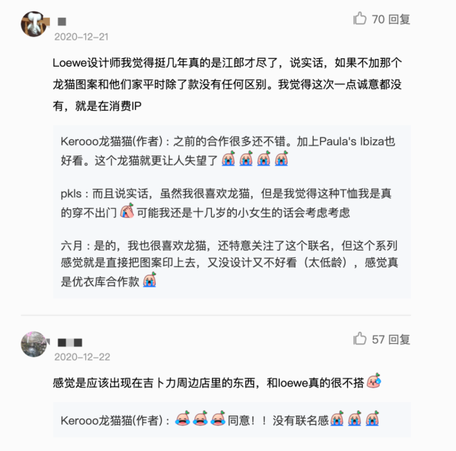 在LOEWE推出《千与千寻》系列之前,其实就曾与另一个同类IP《龙猫》进行过联名,虽然该系列销量不错,但当时已经有小红书用户提出了类似观点,认为“缺乏设计,只是消费IP”。
