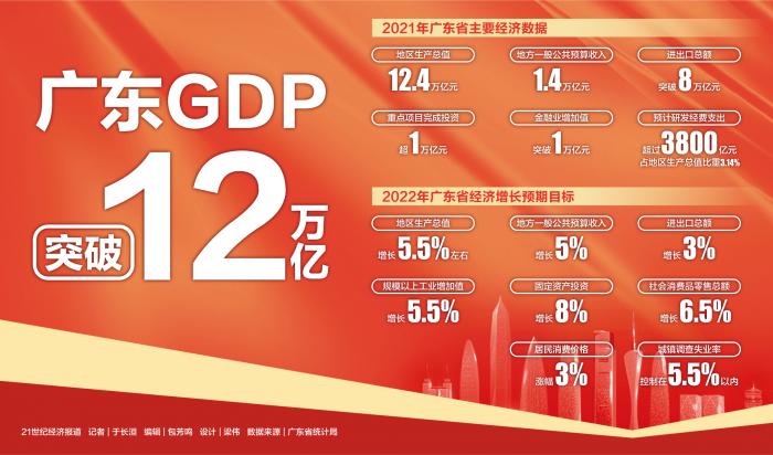 1月20日,广东省第十三届人大五次会议开幕,广东省政府工作报告显示,2021年广东全省地区生产总值达12.4万亿元、同比增长8%。由此,广东也连续33年经济总量位居全国第一。