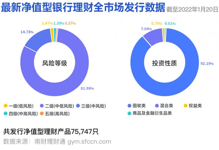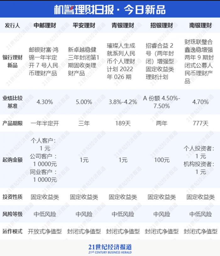 南财理财通课题组选取5只近期发售新品供参考。据南财理财通数据显示,近期,中邮理财“邮银财富·鸿锦一年半定开 7 号人民币理财产品”值得关注。该产品业绩比较基准为4.30%,投资性质为固定收益类,运作模式为开放式净值型,产品起购金额为个人客户1元、公司客户10000元、同业客户10000元,风险等级为中低风险,募集期为2022年1月20日至1月26日。在投资策略上,按照自上而下和自下而上相结合、定性分析与定量分析相补充的方法,对产品资产进行动态的整体资产配置和类属资产配置。