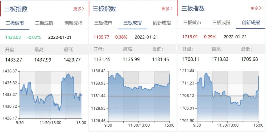 截至1月21日收盘,三板做市报1433.03点,下跌0.02%;三板成指报1135.77点,上涨0.38%;三板创新报1713.01点,上涨0.29%。