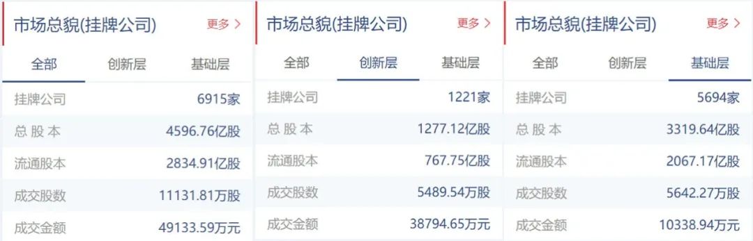 新三板挂牌公司总计6915(创新层1221家,基础层5694家),总股本4596.76亿股,流通股本2834.91亿股。