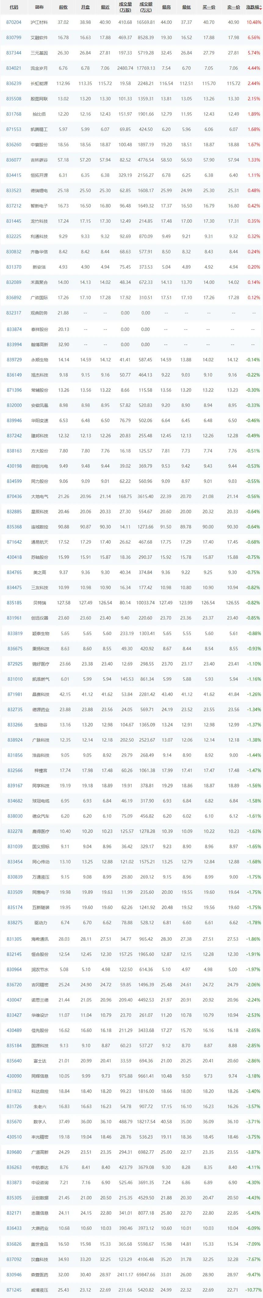 其中,沪江材料(870204)连续两日涨幅居首,上涨10.48%;艾融软件(830799)涨幅居次,上涨6.56%;威博液压(871245)跌幅居首,下跌10.77%;森萱医药(830946)跌幅居次,下跌9.47%。