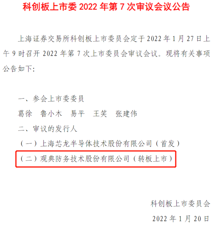 根据科创板上司委员会公告称,上交所科创板上市委将于1月27日上午召开会议,审议观典防务技术股份有限公司的转板上市申请。