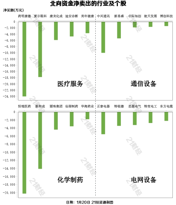 北向资金减持了31个行业,其中医疗服务最多,净卖出金额达3.12亿元,其次是通信设备行业,净卖出2.40亿元。