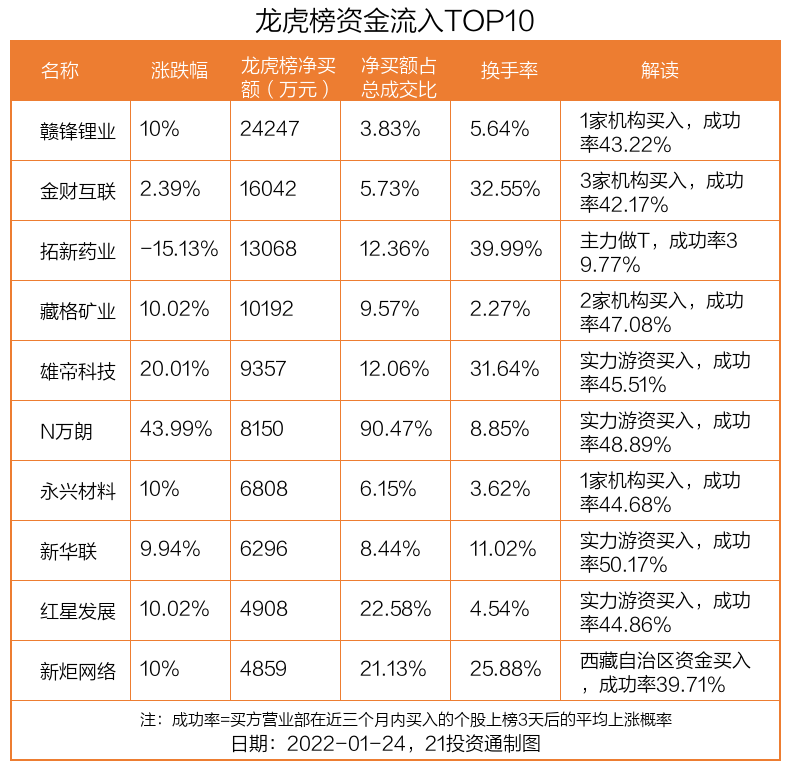 1月24日,上证指数上涨0.04%,深证成指上涨0.37%,创业板指上涨0.72%。盘后龙虎榜数据显示,共有54只个股因当日异动登上龙虎榜,资金净流入最多的是赣锋锂业(002460.SZ),达2.42亿元。