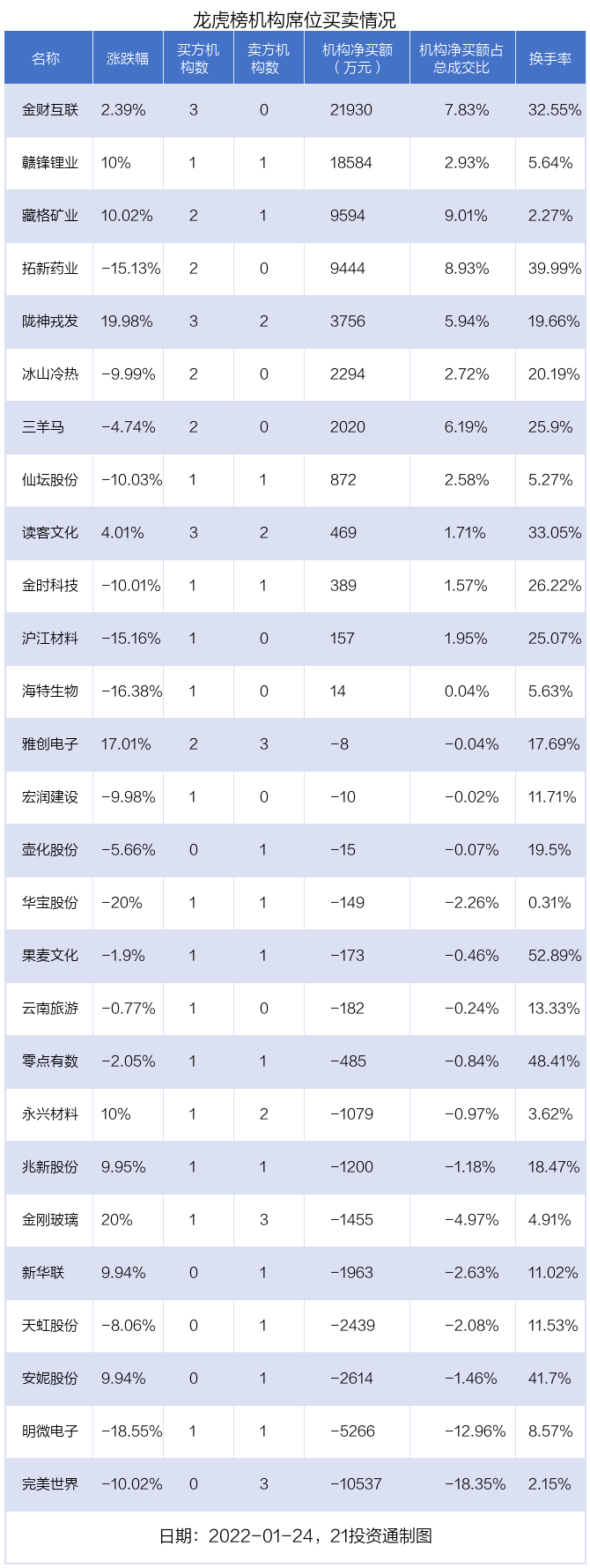 1月24日,27只个股龙虎榜出现了机构的身影,机构合计净买入4.19亿元。具体来看,机构净买入12股,净卖出15股。